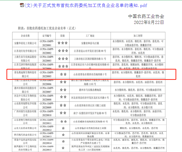 为进一步规范企业委托加工行为,提升农药委托加工相关企业的技术、装备能力和水平,中国农药工业协会计划培养一批农药委托加工领域优良的企业并进行重点扶持,鼓励并支持农药加工企业进一步做强、做优、做大。由全国农药制剂生产企业自愿申请,中国农药工业协会形式审查并组织专家综合审定和网上公示。最终,共17家单位符合《农药委托加工优良企业培育计划》要求并进入了“首批农药委托加工优良企业名单”,青岛奥迪斯生物科技有限公司成功入围,榜上有名。